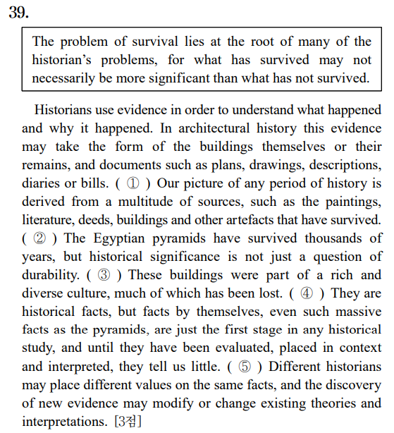 - 39번 (문장 삽입): 역사적 유물의 의의에 관한 글로