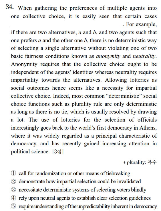 - 34번(빈칸 추론): 둘 중 하나를 선택하는 상황에서 양쪽을 선택한 사람의 수가 동일할 때 이를 tiebreaking하기 위한 수단으로서의 lottery 추첨에 대해 설명하는 글