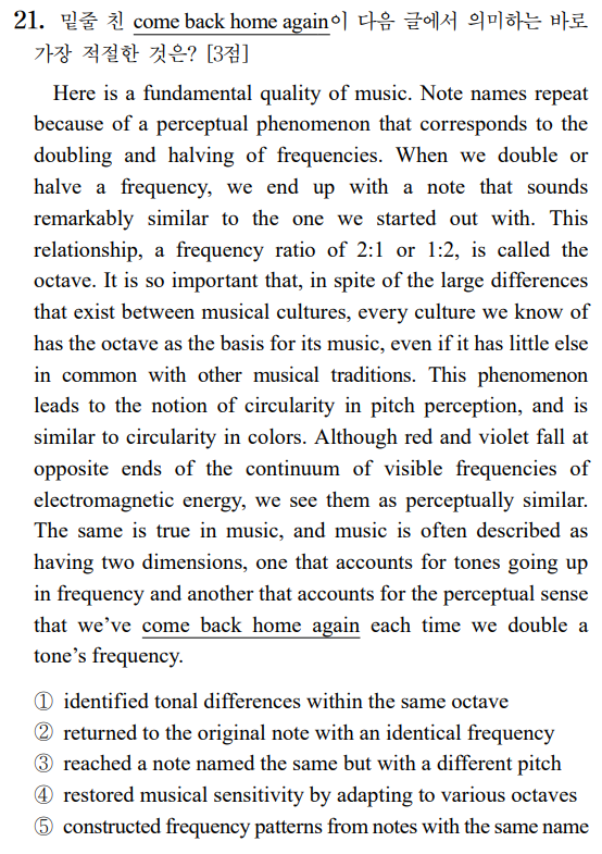 - 21번 함축의미 추론 문항은 서로 다른 문화에 존재하는 음악의 기본으로서의 옥타브라는 frequency 비율과 음의 높이, 인식의 순환성(circularity)을 설명하는 글